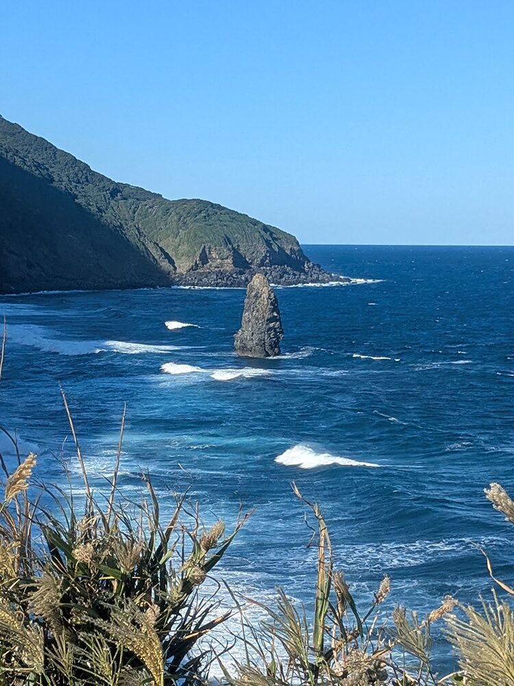 海にぽつんと立つ岩の姿が、まるで筆のよう。自然が作り出した造形美に、2人で見とれていた。