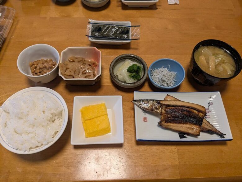 メインの焼き魚に、納豆、卵焼き、味噌汁。